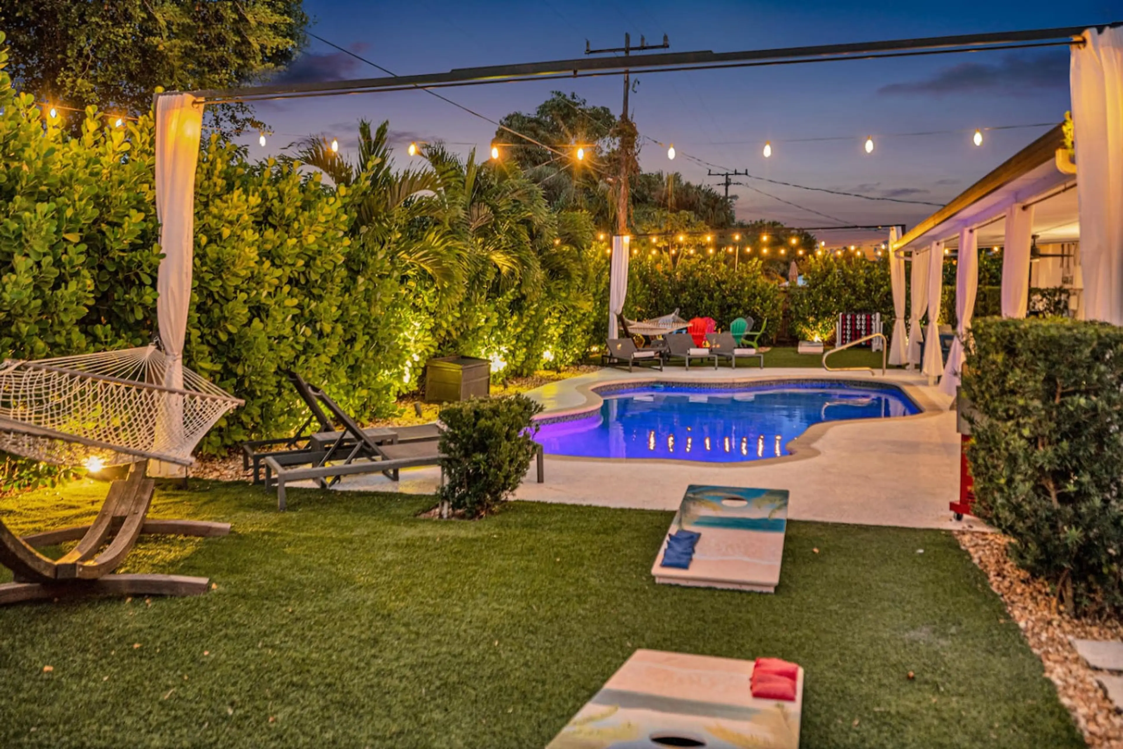 2 homes side by side. Ideal for a group of 16, immaculately clean, remodeled & modern, featuring 6 bedrooms, 4 baths + office. Just 15 minutes to FLL airport. Enjoy a heated saltwater pool, 2 fire pits, hammocks, artificial turf, 3 BBQ grills, night lighting, axe throwing, cornhole, connect 4, pool ...